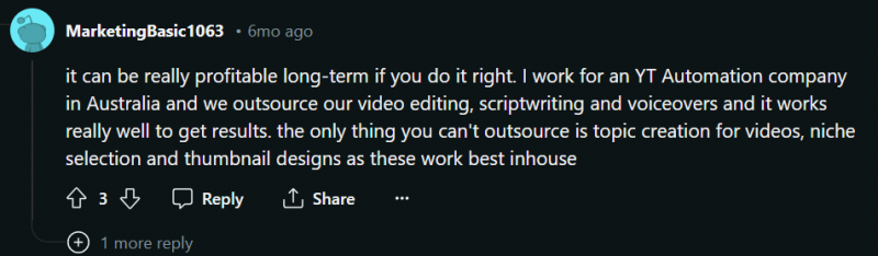 An employee of a YouTube automation company in Australia on Reddit notes that while you can outsource tasks like video editing and scriptwriting, high-level tasks like topic creation and niche selection should be performed by the business owner to ensure it's done right.